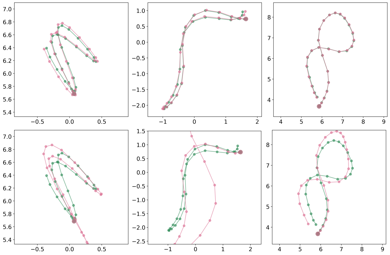 ![]() Predicted trajectories in joint-angle space. Top: Full FA (pink) vs. ground truth (green). Bottom: unified dynamics (pink) vs. ground truth (green). Larger point: shared initial condition. |