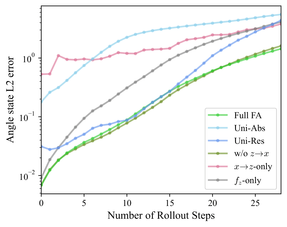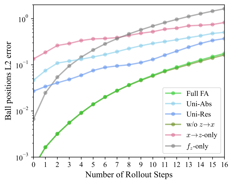 ![]() Predicted trajectories in 3D position space. Top: Full FA (pink) vs. ground truth (green). Bottom: unified dynamics (pink) vs. ground truth (green). Larger point: shared initial condition. |