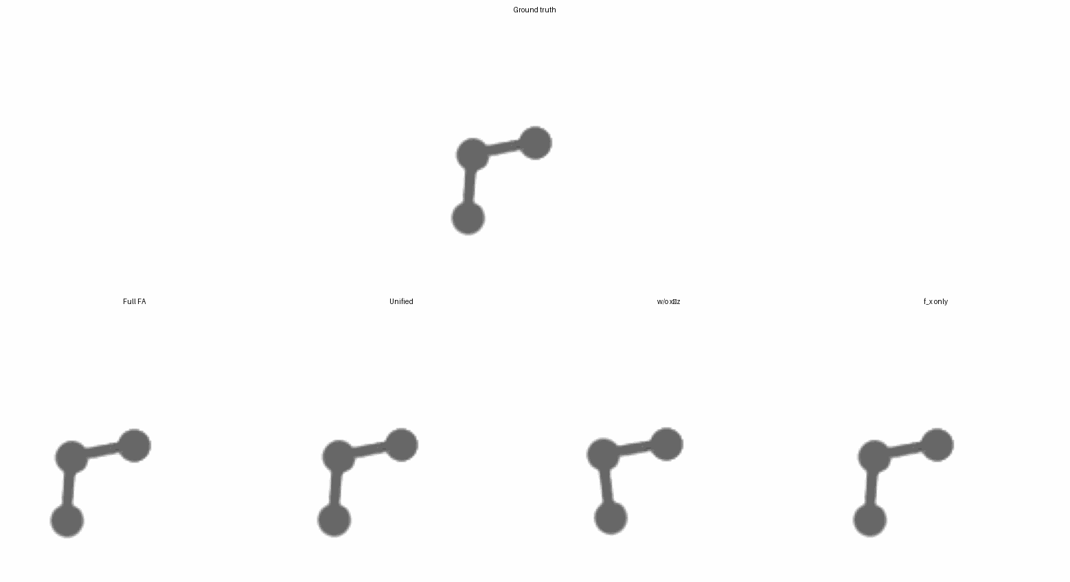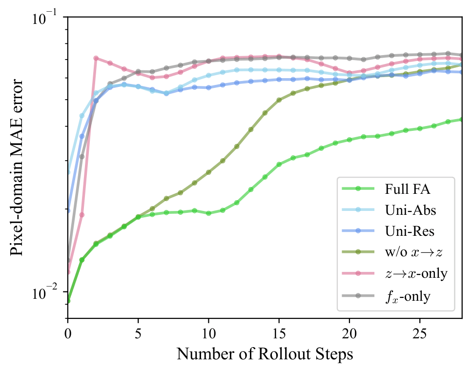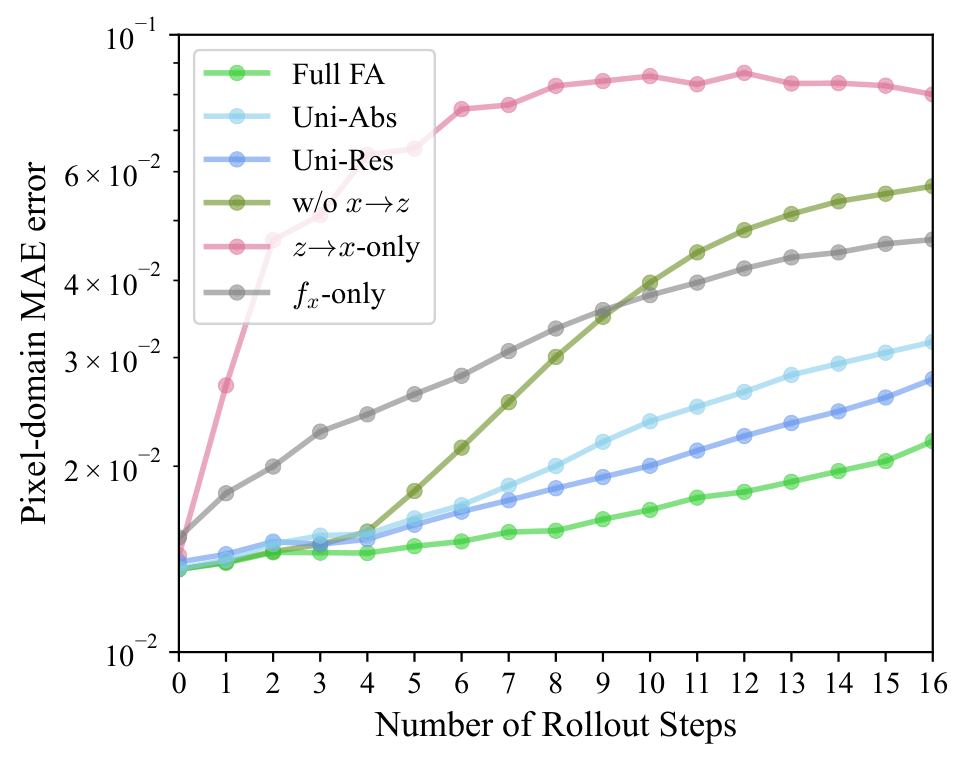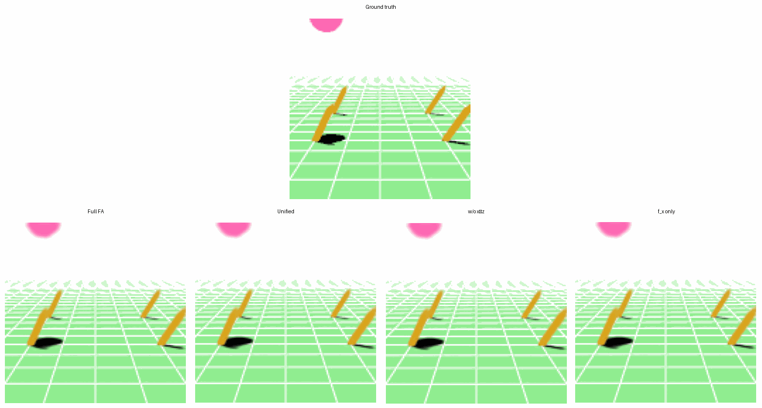 ![]() Top row: Ground truth. Bottom row from left to right: Full FA, Unified, w/o x→z, and f_x only. The pink square indicates the predicted frames based on 1 given starting frame. |