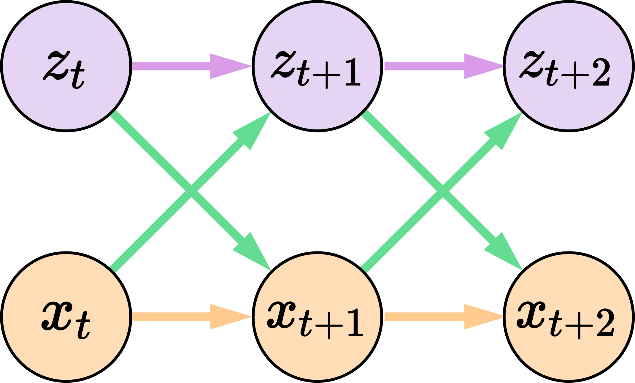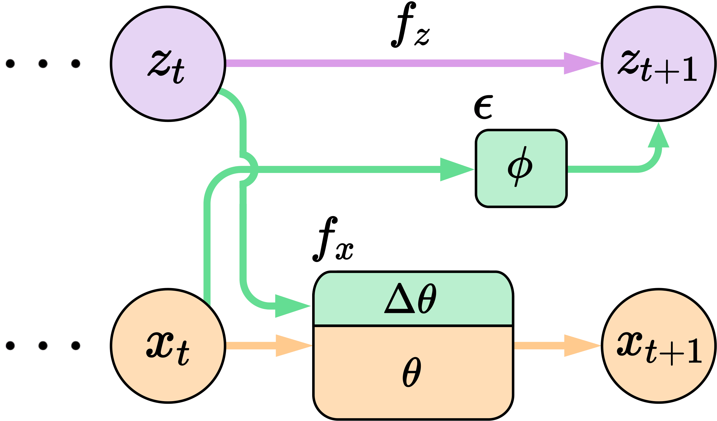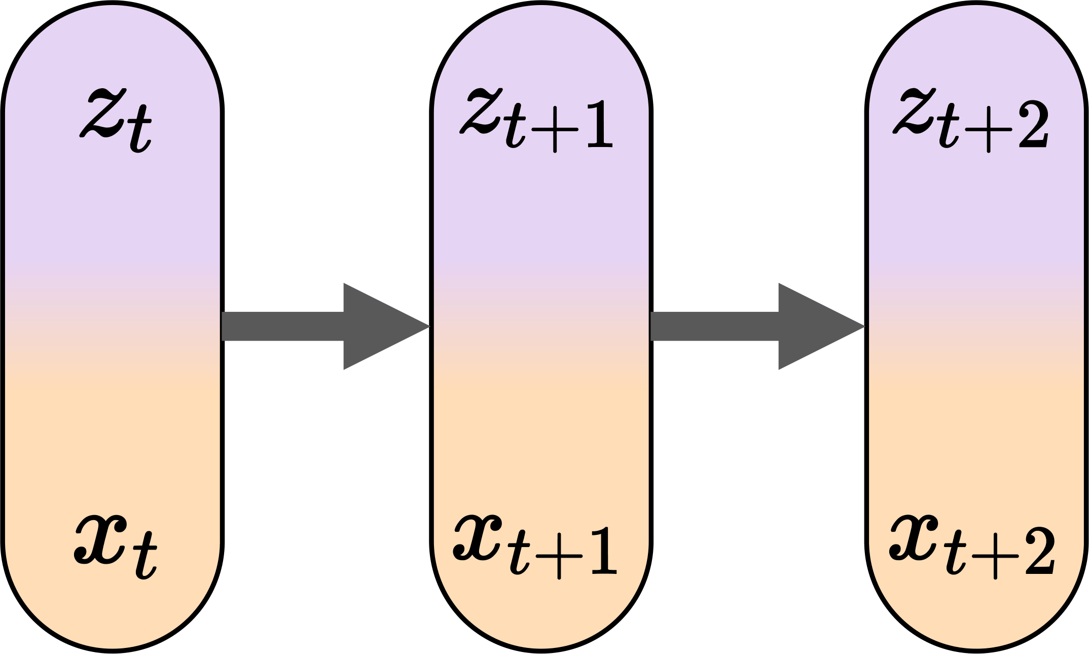 | The double pendulum environment pairs rendered video frames with analytic states containing joint angles and angular velocities. The analytic dynamics use Euler integration, so the state model is compact and physically meaningful but numerically approximate in a chaotic regime. Here, perceptual dynamics are a VideoGPT that models directly the visual observations, while analytic dynamics are still a compact rule-based model. |